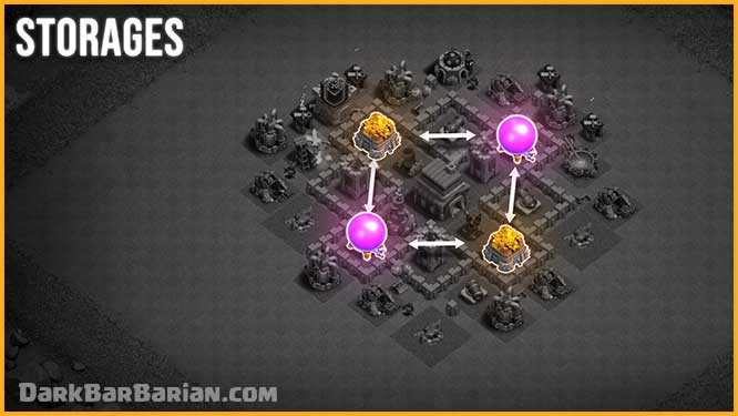 Additionally, we’ve arranged them alternately — so even if one side of the base is destroyed, you won’t lose all storages of the same resource. For example, if all Gold Storages were on one side, the attacker could steal almost all your gold by focusing just there. And if we are losing loot, it is better to lose it in a balanced way rather than losing all of the loot of one kind of resource, so we arrange them alternately, much like our base.