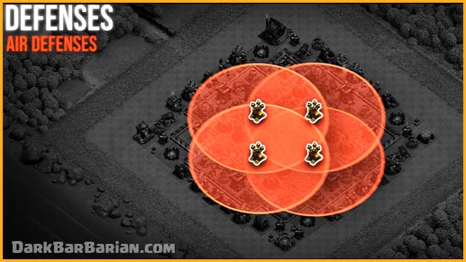 Seeking air mines and air bombs are placed near the air defenses to help the air defenses take out air troops such as balloons, dragons, baby dragons, and lava hounds.