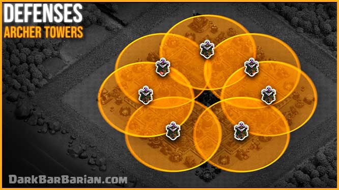 Archer Towers are evenly spaced around the base to provide consistent air and ground coverage from every direction. This helps maintain balance and prevents attackers from finding an easy entry point.