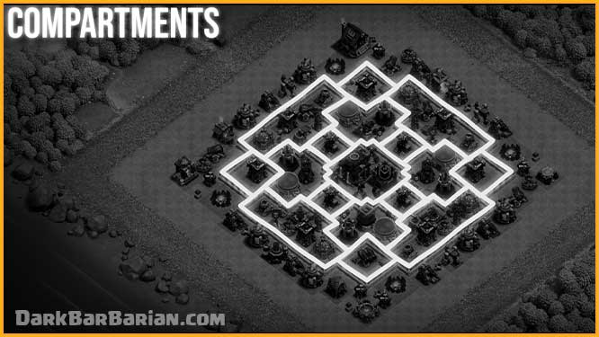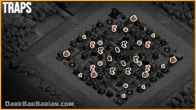 Now coming to the placement of the traps, after observation of so many attacks on this base, spring traps are strategically placed in different compartments according to the pathing of defense attacking troops like hogs and giants, which helps in making this base stronger against ground attacks.