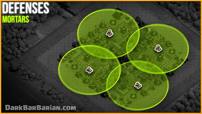 Mortars are positioned closer to the outer layer of the base. Their main purpose is to counter spam attacks such as BARCH, GiBARCH, and mass goblins. Even though they’re placed near the outside, their range still reaches deeper sections of the base, making them useful throughout the attack.