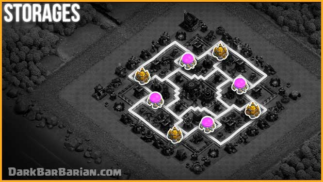 Also, don’t place both of the same type of storage on the same side — for example, putting both Gold Storages on one side would allow the attacker to steal nearly all your gold just by targeting that section. As a result, in order to avoid this. We alternate their placement, much like this base.