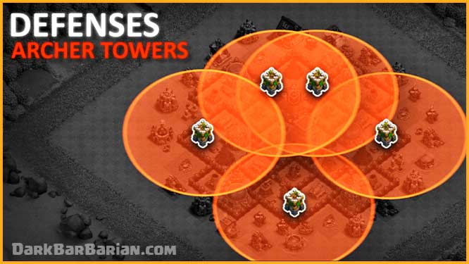 Archer Towers are positioned around the base to provide full 360-degree coverage. Their placement ensures there are no blind spots, making the base strong against both air and ground attacks.