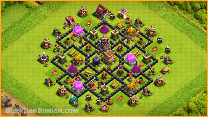 Air attacks are very common at Town Hall 8, especially Mass Dragons and MassLoon, so air protection is a top priority in this layout.