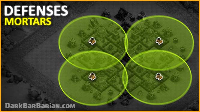 Mortars are placed in compartments where their range covers a large portion of the base. They are extremely effective against groups of low-health troops like barch, gibarch,and mass goblins and help stop fast farming armies early in the attack.