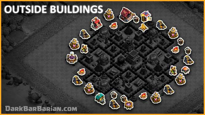 The outer buildings are spread out evenly around the base to prevent easy funnel creation. Similar buildings are not grouped together, which makes it harder for attackers to clear the outside quickly and saves valuable time on defense.