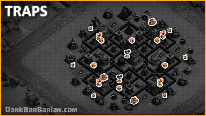 Now coming to the placement of the traps, after observation of so many attacks on this base, spring traps are strategically placed in different compartments according to the pathing of defense attacking troops like hogs and giants, which helps in making this base stronger against ground attacks.