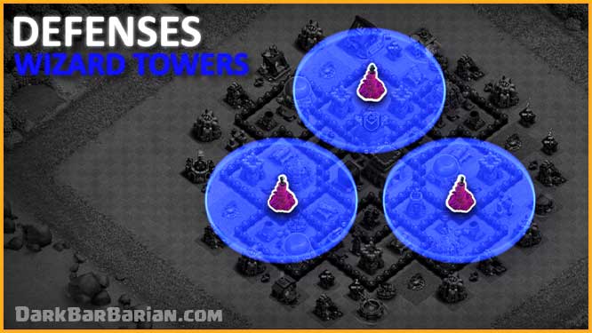 The Wizard Towers are placed in different compartments around the base, covering storages and high-traffic areas. Since they deal splash damage to both ground and air troops, this placement is very effective against spam attacks like BARCH, Mass Goblins, and Balloons.